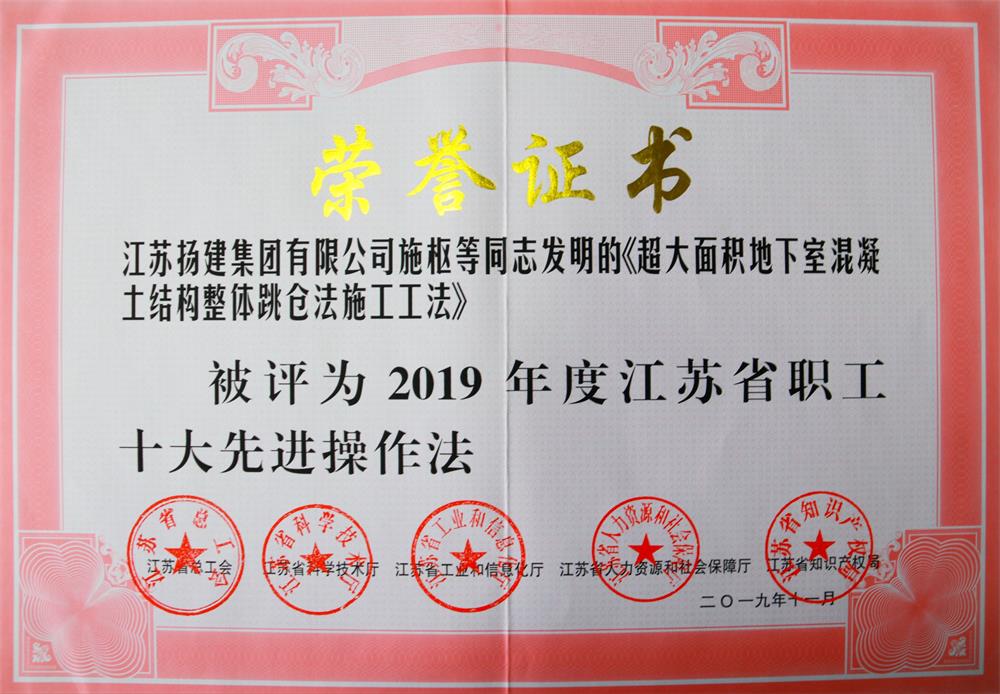 揚建網訊 五一前夕,江蘇省職工十大科技創新成果、十大先進操作法、十大發明專利評審委員會對2019年度江蘇省職工十大科技創新成果、十大先進操作法、十大發明專利評選結果進行公示、表彰。我集團項目管理一公司施樞等同志發明的“超大面積地下室混凝土結構整體跳倉法施工工法”榮獲2019年度江蘇省職工“十大先進操作法”。