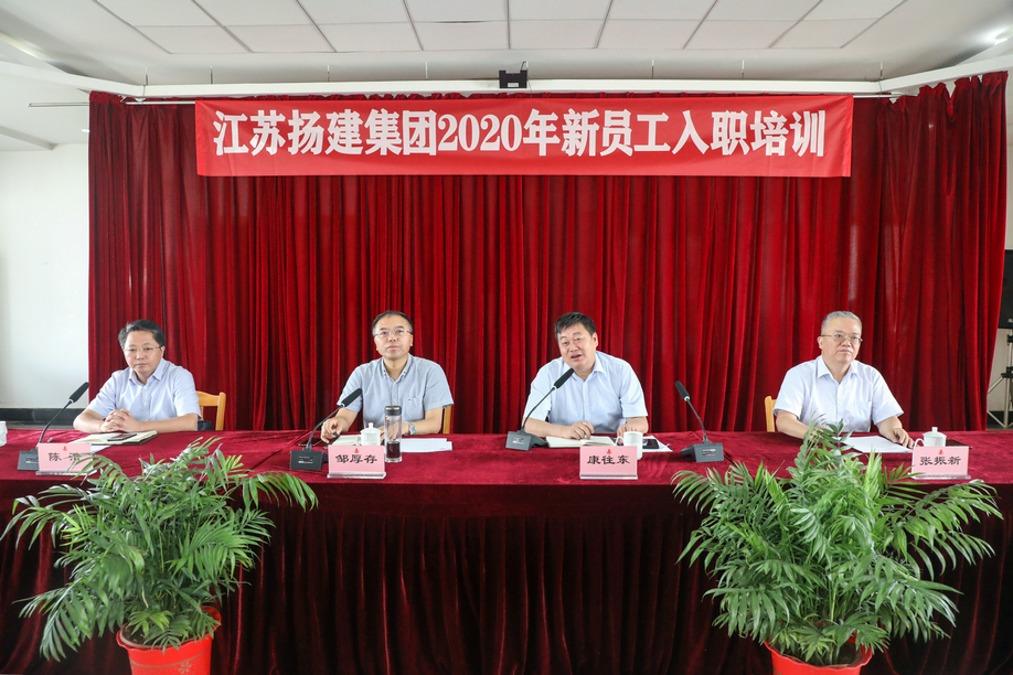 揚建網訊 7月20日上午九點,集團在鹽阜辦公區七樓會議室舉辦2020屆新員工與公司領導見面會。會議由集團黨委副書記張振新同志主持,集團公司董事長、集團黨委書記康往東、集團公司總經理鄒厚存、集團黨委副書記陳滸出席了會議。