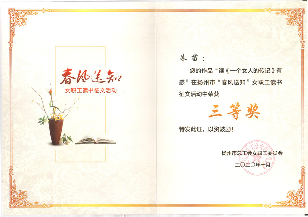 揚建網訊 日前,在揚州市總工會舉辦的揚州市“春風送知”女職工讀書征文活動中,集團工會積極響應,并在集團職工電子書屋推送素質提升閱讀書目,鼓勵女職工做到“讀有所享、讀有所創、讀有所為”。我集團工會書香揚建——向戰“疫”中的巾幗英雄致敬活動共收到征文11篇并報送市總工會,集團工會在活動中獲得優秀讀書項目獎。此外,集團人力資源部朱苗撰寫的《讀<一個女人的傳記>有感》征文從996篇作品中脫穎而出,榮獲三等獎。
