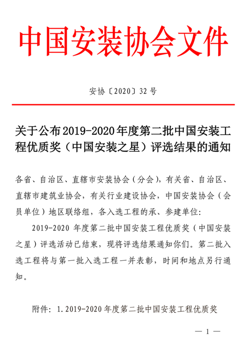 揚建網訊 日前,中國安裝協會公布了2019-2020年度第二批中國安裝工程優質獎(中國安裝之星)評選結果,由集團機電分公司和環保公司共同申報的“江廣智慧城F地塊項目、K地塊項目工程施工(F地塊項目)安裝工程”和“TPI風機葉片生產廠房建設工程安裝工程”榮獲年度“中國安裝之星”稱號,這也是繼安裝產業板塊參建的新建萬福大橋工程和揚州中學教育集團樹人學校高中部榮獲“國家優質工程獎”后,再一次捧回“國字號”質量獎項。
