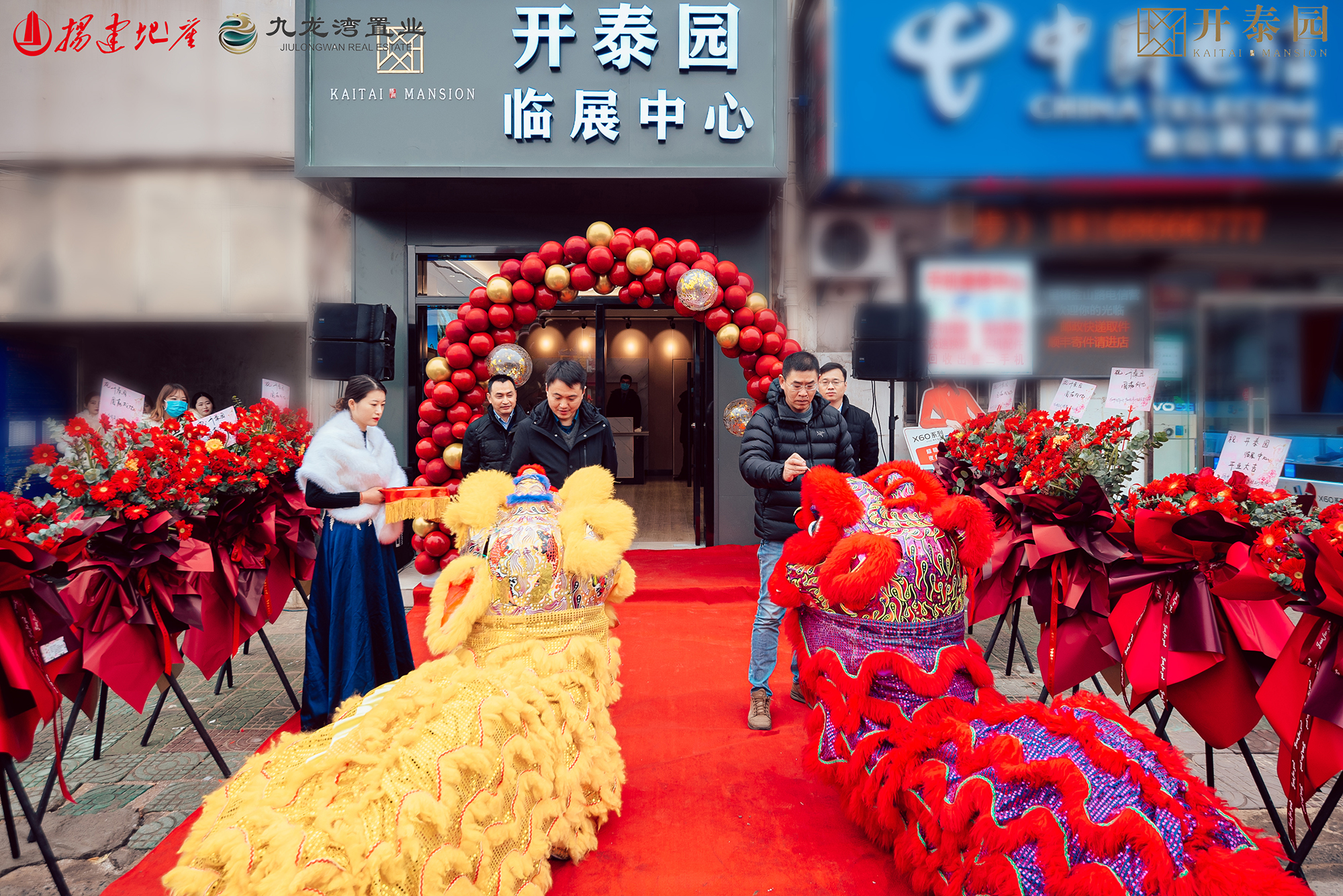 儀式上,華達(dá)地產(chǎn)總經(jīng)理呂建與開發(fā)商揚(yáng)州九盛置業(yè)有限公司領(lǐng)導(dǎo)一起為開泰園臨展中心開放剪彩揭幕,呂建總經(jīng)理還與九盛置業(yè)董事長劉震先生共同為祥獅點(diǎn)睛,一同慶賀與城市共榮的這一時刻。