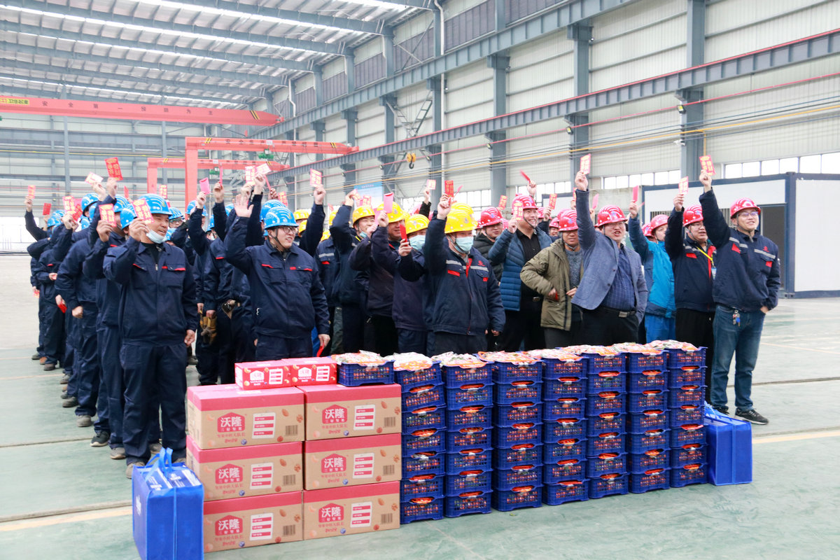 活動現場,在鋼構公司經理王嶸的陪同下,曹德榮董事長一行深入車間,了解鋼構公司生產經營狀況、職工勞動保護情況等。曹董事長與留守崗位非揚州籍員工親切交談,對他們響應國家號召,自愿留揚過年、減少人員流動帶來疫情傳播風險的行為表示高度贊揚,對堅守在揚的建設者們表示慰問。曹董事長此次一行還給留揚員工送上了慰問金和慰問品,表達了集團對他們的關懷,祝福他們在揚州過一個愉快祥和的春節。