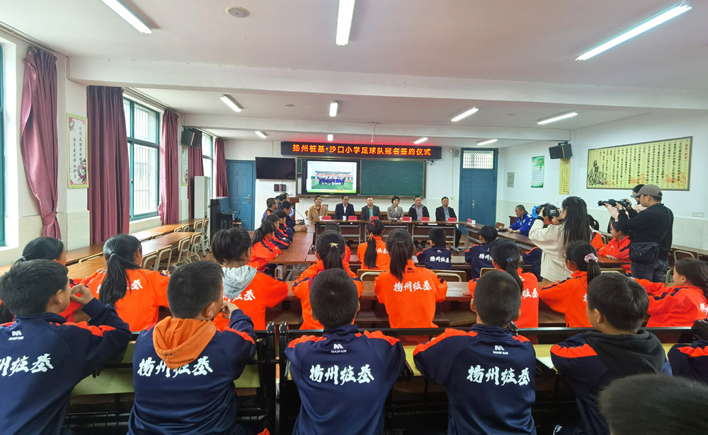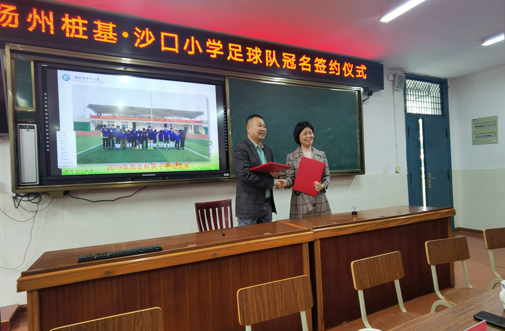 揚建網訊 月20日下午,揚州樁基、沙口小學足球隊冠名簽約儀式在揚州市沙口小學舉行。廣陵區教育體育局副局長陶孝志、體育科科長徐熠、沙口小學校長呂祝娟、樁基公司總經理于金濤、黨支部書記夏志宏、工會主席蔣珍如出席活動。