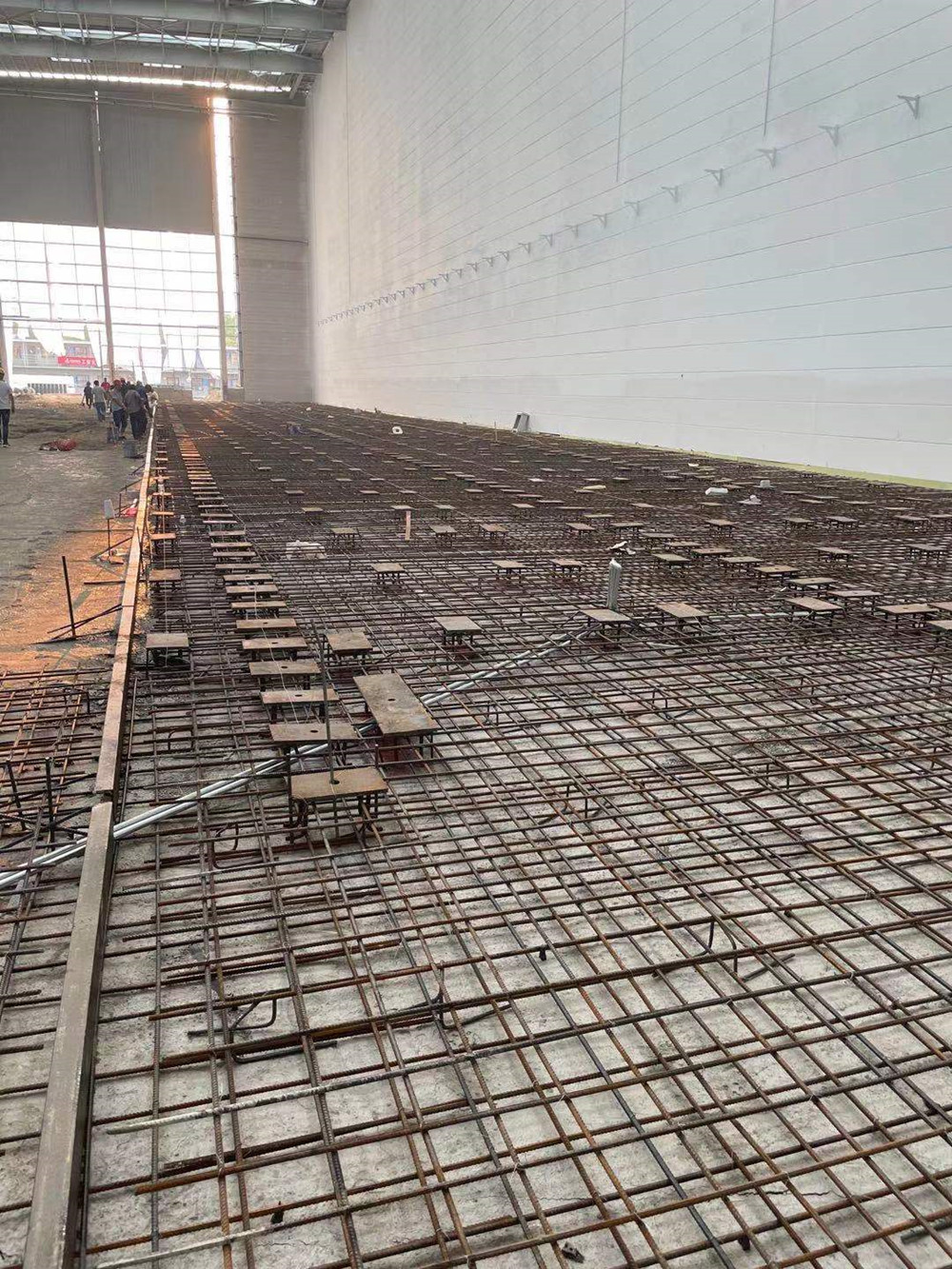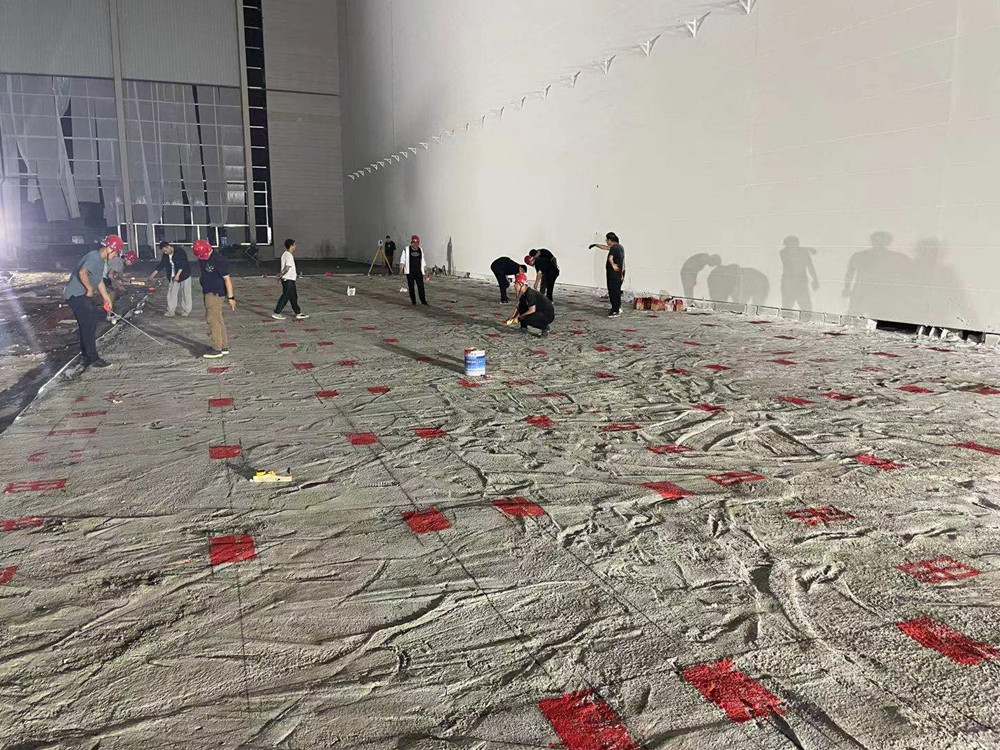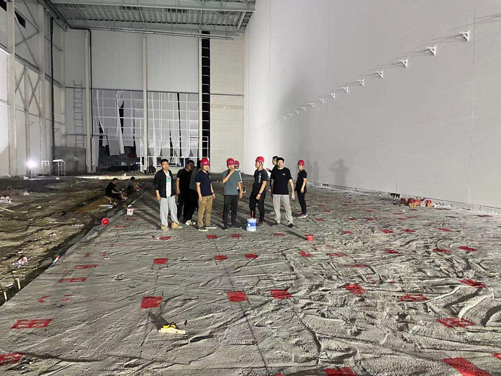 同時進(jìn)場,分進(jìn)合擊。隔墻板安裝隊組、地坪隊組、油漆隊組等多家隊組同時入場施工,面對多隊組交叉作業(yè),項目部做好了充分的計劃安排及保障措施。4000多平方米、24米高的立面隔墻板安裝,兩家隊組從東西兩個方向同時安裝,30個工人,耗時140多小時,安裝了2000多塊隔墻板。過程中,安裝隊組攻克了預(yù)制的ALC墻板訂貨周期長、工人在夏季長時間高空作業(yè)等各種困難。油漆隊組緊跟安裝隊組,隔墻板裝好一個工作面就緊跟另一個工作面。墊層、防潮膜、保護(hù)層、放線、扎鋼筋、鐵件預(yù)埋、關(guān)模、澆筑地坪……在有限的時間里道道工序,層層把關(guān),都有條不紊地順利完成。