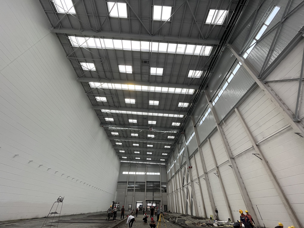 專業(yè)公司,齊心協(xié)力。6月7日下午15時,最后一塊鋼梁吊裝結(jié)束,這意味著立體倉庫主鋼架全面完成。但鋼結(jié)構(gòu)單位卻絲毫不敢松懈,等待他們的還有2400多平米的立體倉庫屋面,從檁條安裝到屋面底瓦、隔氣膜再到巖棉、柔性防水,他們都井然有序一一完成。水電安裝在不到20天的時間里將消防水主管、虹吸雨水管道系統(tǒng)、空氣采樣管、消防弱電管路、照明及排煙窗布線全部布置到位,累計安裝管路1200多米。立體庫內(nèi)最多達(dá)20臺各類起重登高機(jī)械,專業(yè)公司和總包一起,緊湊穿插時間和空間,日夜奮戰(zhàn)、分頭落實(shí)目標(biāo)。