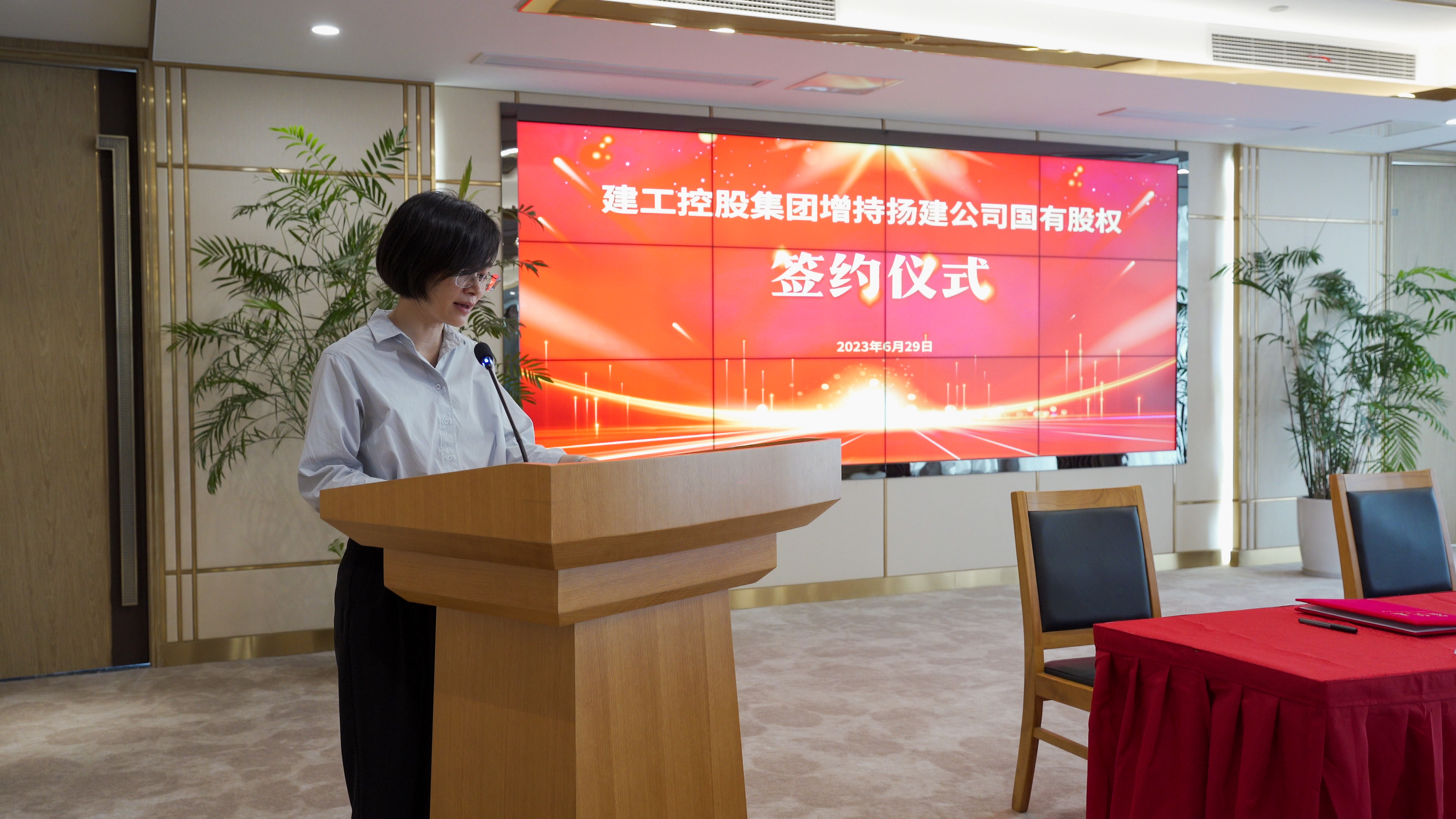 揚建網訊 6月29日上午,江蘇揚建集團有限公司國有股增持簽約儀式在揚州華城科技廣場舉行。本次儀式由市國資委黨委委員、副主任滕蔓主持,市國資委有關處室負責人、建工控股集團黨委在揚成員、我集團公司董事長康往東、總經理鄒厚存、副總經理陳滸、華融公司董事長曹德榮等參加。