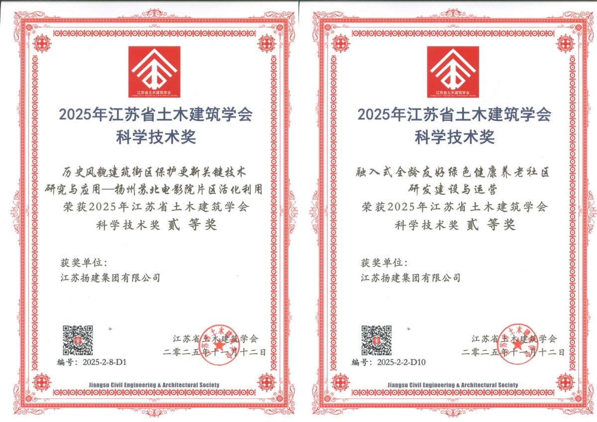 揚建網訊 近日,集團科技創新領域再獲殊榮。在江蘇省土木建筑學會第十一屆理事會第五次會上,由集團技術部牽頭,聯合項目管理一公司、市政工程分公司、機電安裝分公司、揚州廣陵建工有限公司、江蘇華發裝飾有限公司共同完成的“歷史風貌建筑街區保護更新關鍵技術研究與應用——揚州蘇北電影院片區活化利用”成果獲得表彰,被評定為“2025年江蘇省土木建筑學會科學技術獎”二等獎。