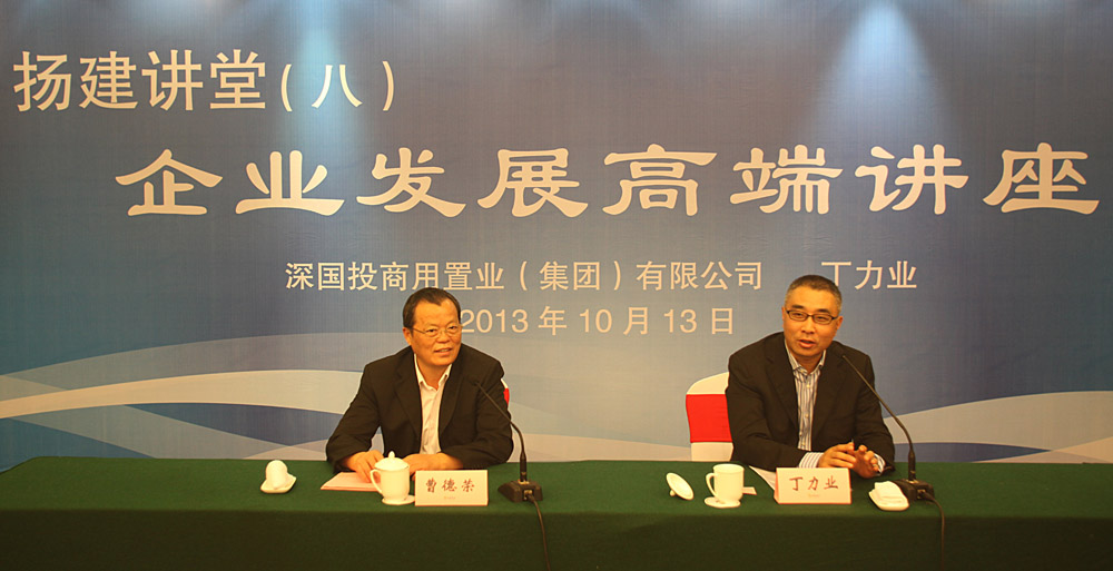 2013年10月13日上午,深國投商用置業(集團)有限公司(以下簡稱深國投商置或“SCP”)董事長、首席執行官丁力業先生應邀來揚,在揚州西園飯店二樓和萃廳,面對參加第八期“揚建講堂”培訓班的80余位揚建骨干,就企業創業、商業模式、經營理念、管理心得等方面的話題作了精彩講授與誠摯溝通。